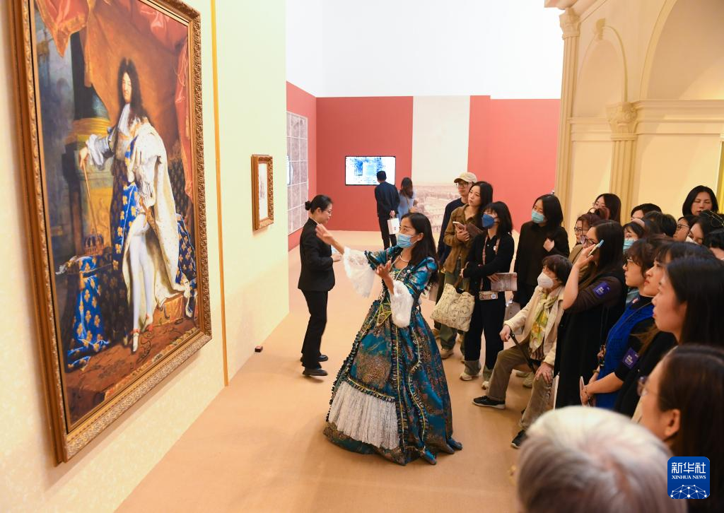 4月14日,工作人员向观众介绍路易十四肖像(左)和依据此画创作的19世纪蚀刻版画作品(右)。