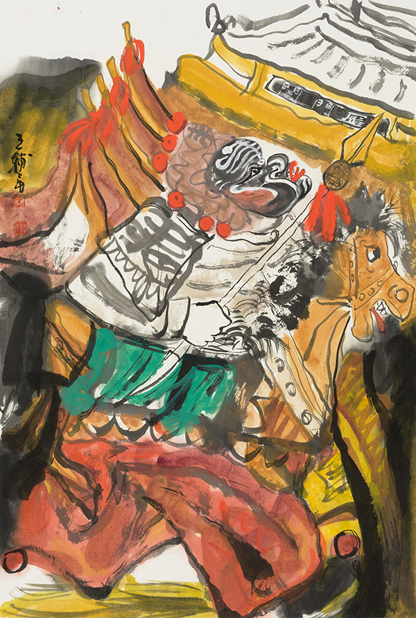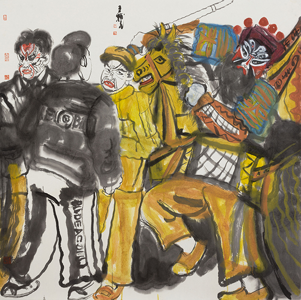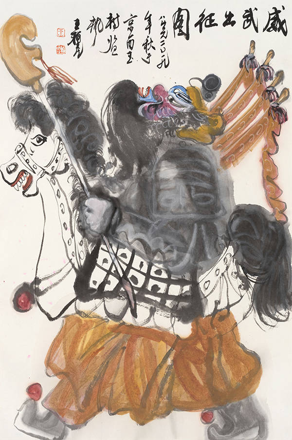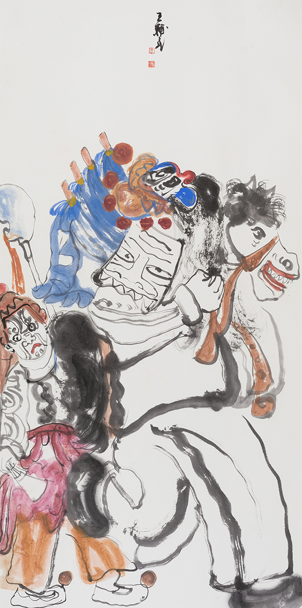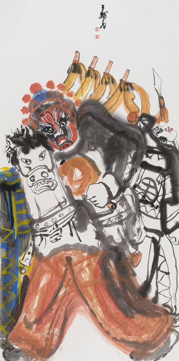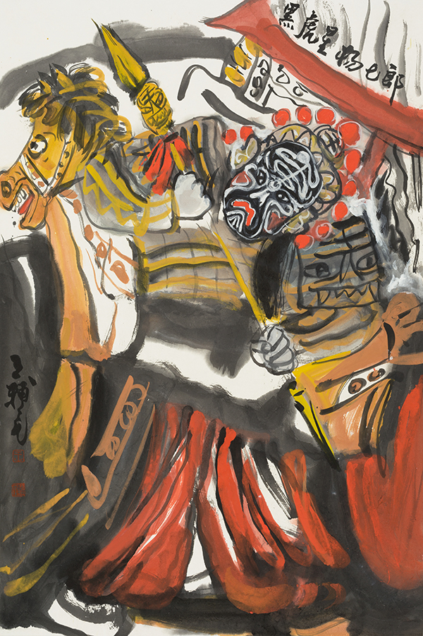 中国社火题材的大写意中的“写意”这个概念的包容性很大,也可以有痛苦的宣泄,如徐渭、八大山人的某些作品,但即便如此,那些作品也是美的,是中国式的。王辅民画的社火是传统写意画的形式,是笔墨和传统色彩在说话。社火和西方的狂欢节比较相似,是外在、热闹、欢乐的基调,不是内在的、孤愤的、批判的基调。它可以荒诞幽默、可以升华发展,是一种中国式的狂欢。社火本身既有内容,也有形式。画社火,要重内容和形式。作为绘画的社火,可以分为两类,一类是画社火本身,如同关良画京剧人物,画出独特的风格和意趣。另一类是把传统社火与现实题材结合起来,即辅民说的“切入现实”,传统社火与现实人物融为一体,成为具有共生内容与形式的现代观念性绘画。这两类绘画,都具有社火的幽默夸张、动态诸元素。前者则应像关良一样,越画越简练、传神。像关良那样熟悉京剧,熟悉文人画,熟悉传统笔墨等等,达到很经典、很中国,能与传统绘画的精髓接得上。后者则以二者的结合,以表达某种现代性的观念为目标。前者属于有生命力的古典绘画,后者则趋向杂交性的现代绘画。