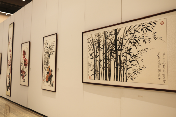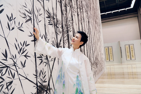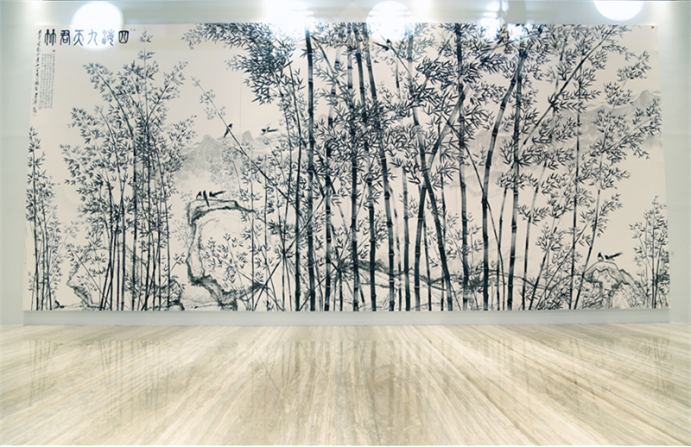 李小琳在诗书画方面极具天赋,并触类旁通,将所思所感自然而然地融入到作品当中。此次展出的楹联作品均为八尺四裁竖幅大作,通天委地、字阔如斗,用墨厚重扎实,章法稳定。六幅丈八尺宣组成(近820平尺)的水墨画——“九天君竹”,是她迄今创作的最大尺幅的竹林图。李小琳所画之竹富有灵性和智慧,整幅画作气韵生动,形神兼备之余更具磅礴之势,画面错落有致、浓淡得宜,竹子枝干遒劲、坚韧挺拔,可见其修身修意德行之深厚。