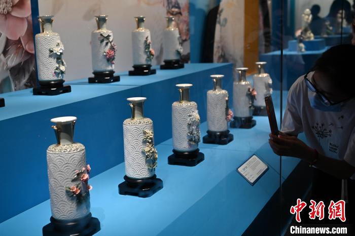广东潮州枫溪瓷“友谊”通花瓶吸引参观者。 陈楚红 摄