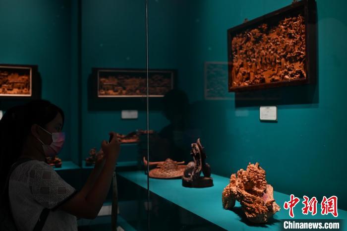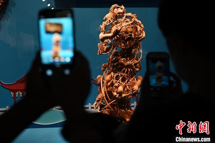 广东潮州木雕《立体蟹篓》吸引参观者拍照。 陈楚红 摄