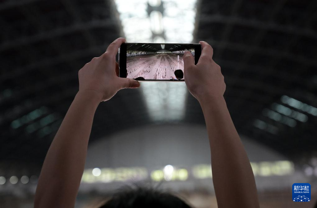8月23日,一名游客在秦始皇兵马俑博物馆参观时高举手机拍照。