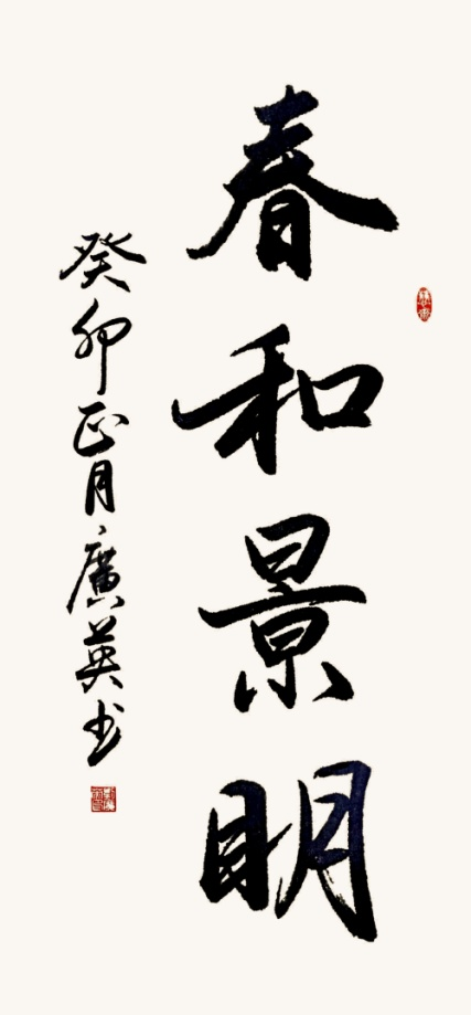 书法艺术与中国文学天生有一种深切的因缘关系。然而在当代就书法艺术这一方面来说,它对中国文学有着更强的依附性。当代文学可以不依赖书法艺术来表现,但当代书法艺术离开了文学内蕴,就显得苍白无力。刘广英的书法特点最具文人抒情性,这缘于她自身的禀赋与修养使然。“观人于书,莫如观行草”,行书,是最能胜任“达其情性,形其哀乐”的书体。刘广英作为文人,学养丰厚,思绪的线条连贯而流畅,正与行书抒情特性的线性书写相契合。其字书写畅达、抒情自然、卷气充盈,具有妍雅飘逸的风格,有一种温文尔雅的正人君子风范,素挥雅操、清声随风起的境界。轻快的笔调,自然大方,超然不拘,流畅的线条,表现出一种潇洒飘逸、倜傥风流的名士之美,如李太白诗“兴酣落笔摇五岳,诗成笑傲凌沧洲”。书作《学无止境》注重“势”的把握,笔势飞动,用笔稳健。其字尽含“参己意”“追古法”的洒脱与遒劲之美。书作《春和景明》字主藏锋,用笔秀润,遒逸飞动,结构精密,肉骨均和,表现出高贵秀美的气质。