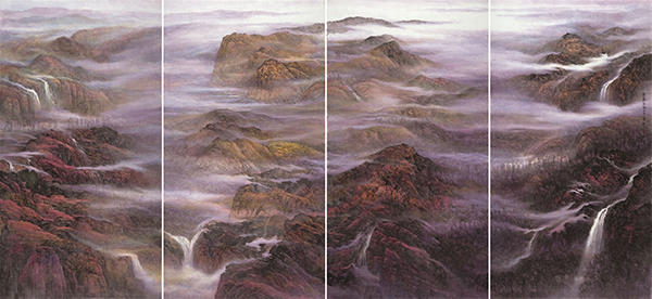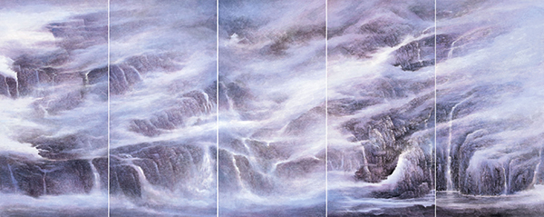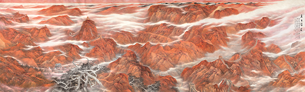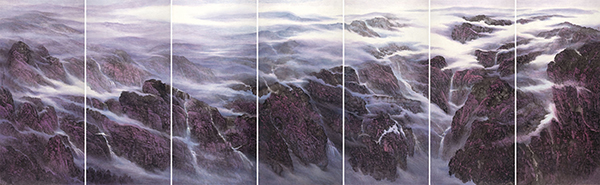 且看乐震文的《直上浮云》《云卷云舒》和《黄土驰风,日月星辰》,那逶迤茫茫的群山峻岭,那纵横画面的云蒸霞蔚,那连绵不绝的箭楼城堞,哪里还是传统文人山水画的淡烟轻岚,缥缈冷逸?浓缩于画内的精神意蕴,分明凸显了现代山水画对家国情怀的抒发。且读张弛的《云起叠嶂》《惟余莽莽》和《紫气氤氲》,那天光紫气的浩渺烟云,那浑然一体的山水气象,那千回百转的流水飞泉,其实早已脱离了对自然山水的写照,而是她感悟的时代精神在偌大画面上的纵横挥写、主观臆造。