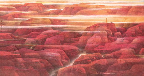 来自上海并深受海派画学影响的乐震文、张弛,在宋元及明清山水画学上打下了深厚的功底,也因此,他们的传统山水画深受日本民众的欢迎。他们曾游居东瀛多年,转道再度研习了中国传统文人画。但真正改变他们画风的,却是他们对中国北方大山大水的写生揽胜。他们钟情于英雄的太行山,忘情于革命胜地陕北高原,力求通过壮阔雄浑的山峦、连绵逶迤的群峰来表达他们的时代感悟,营构储存于他们胸中的山川气象。所谓“山河回声”,正是这些作品抒发的中华民族历经岁月风华在大好河山之中回响的奋斗激情。