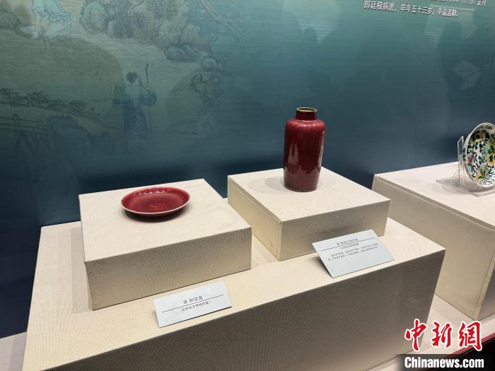 在“督陶相继”单元展出的文物均为沈阳故宫院藏康、雍、乾时期的精品瓷器,如“清郎窑红筒式瓶”“清康熙款豇豆红玉壶春瓶”“清雍正款鳝鱼黄釉双兽耳海棠式扁瓶”“清乾隆款黄釉牺耳尊”等。创烧于清代康熙年间的郎窑红是铜红釉中最鲜艳的色彩,它是由江西巡抚兼御窑厂督理郎廷极主持景德镇窑务时所创烧的一种瓷器。据介绍,郎窑红仿烧明代宣德祭红,其釉色鲜红浓艳,有强烈的玻璃光泽。釉层清澈透亮,釉面开裂纹;底足内呈米黄色或浅绿色,俗称米汤底或苹果底,少数为本色红釉底;器物口部露骨多呈粉白、淡青或浅红色,大多数器身垂釉呈黑褐色,并且多不过底足旋削线,俗称“郎不流”。