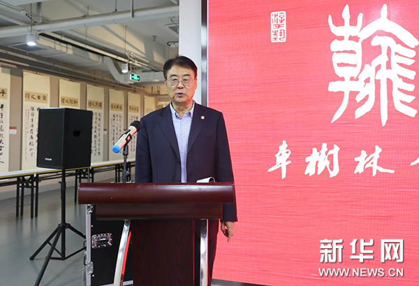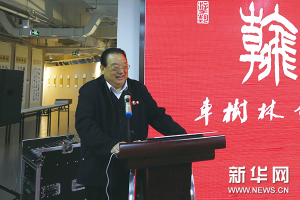 车树林致答谢词,感谢各位嘉宾的鼓励和支持,感谢李殿仁从不同角度给予本次展览恰如其分、高屋建瓴的总结,感谢恩师苏士澍的鼓励,感谢潘衍习、何小平两位精心创作诗联佳作,这些都是对他的巨大鼓舞和激励。各位老师、朋友在此次展览中提出了很多宝贵的意见,助力他创作出更多更好的作品,奉献给社会,奉献给党,奉献给人民。用艺术弘扬红色文化;翰墨颂辉煌,以书法传递国策精神。