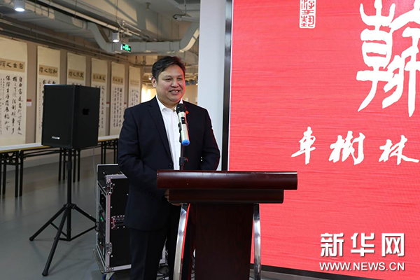 潘衍习致辞,他表示车树林是苏士澍非常优秀的学生,他的书法很好地诠释了唐代柳公权“用笔在心,心正则笔正”的理念。他有感而发,创作《车树林书法赞》一诗,赞美车树林书法:“树高千尺起根芽,林做笔材功可涯。书取先贤诸体美,法从参悟自成家。”