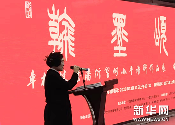 何小平致辞,他表示今后将继续用优秀诗联助力书法创作,与广大书法工作者一道,共同书写“坚持文化自信,建设文化强国”的新篇章。他特意撰联《赠车君树林》,对车树林书法予以充分肯定:“师毋泥古,创不逾规,根正苗红堪作栋;博采众长,独擎一帜,山容水态始称家。”
