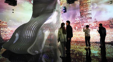 12月21日,参观者在莫高窟第285窟东披壁画(复制品)展品前交流讨论。