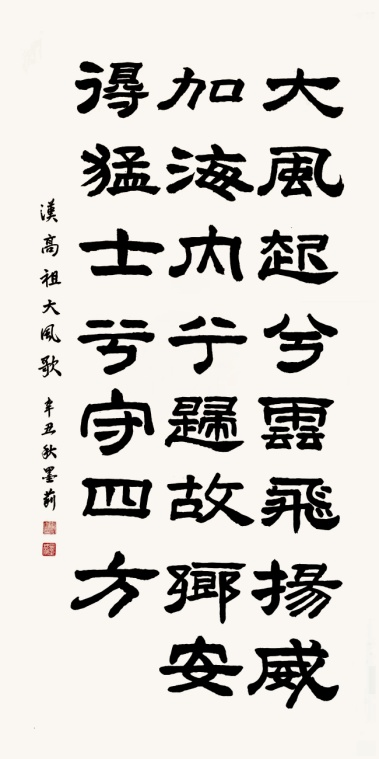 杨清丽不仅国画造诣深厚,其书法也是独具一格。她书写的《大风歌》笔力力透纸背,线条自然爽利,书法的意趣被发挥到了极致。观其字劲中带柔,稚中寓秀,灵气飞动,一撇一捺显得静中有动,飘然欲仙。其作品的筋骨、墨韵,处处都透露着抽象之美,有着独立的审美价值。综合来看,杨清丽的作品充满了独特的艺术魅力和丰富的情感深度。她以深厚的传统根基为基础,融入新水墨的创意精神,展现出鲜明的个性创造和时代精神。其作品不仅有着高超的艺术技巧和深刻的内涵,更有着雅俗共赏的可贵品格。(文/李新宇)