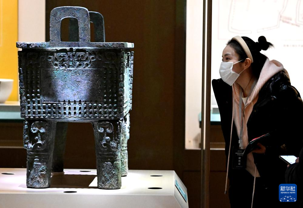 2月26日,参观者在河南安阳殷墟博物馆新馆内观看展品“司母辛”铜鼎。