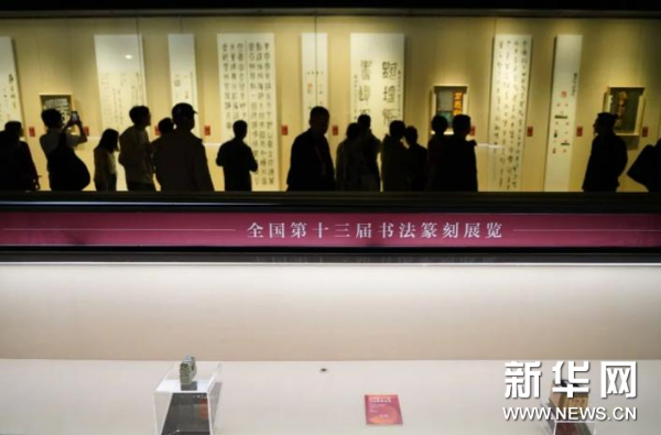 开幕式后,领导嘉宾参观全国第十三届书法篆刻展览(浙江展区)和学术专题特展“大匠运斤——近现代浙江篆书篆刻名家作品展”。