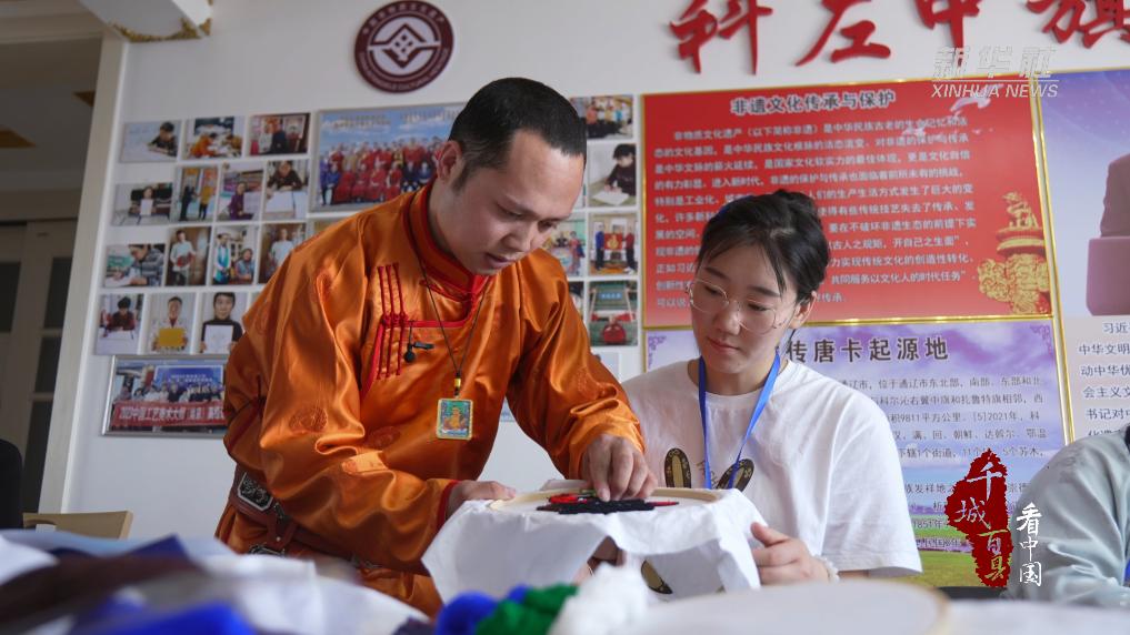 在内蒙古自治区通辽市科尔沁左翼中旗,工艺美术师李腾飞正在为唐卡爱好者传授制作技艺。