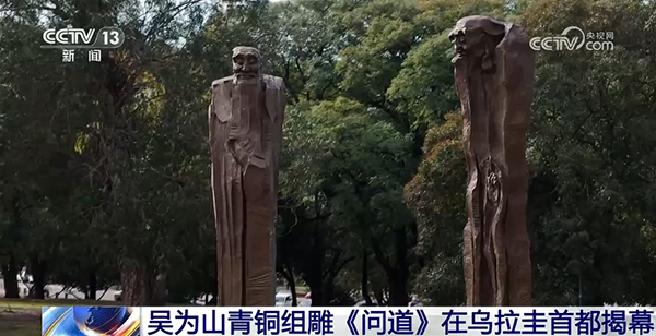 当地时间5月29日,国际著名雕塑家、中国美术馆馆长吴为山的青铜组雕作品《问道——孔子问道于老子》在乌拉圭首都蒙得维的亚揭幕。