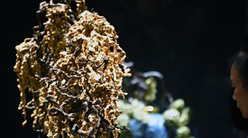 8月31日,参观者在中国美术馆参观拍摄展出作品“鸡冠花”。
