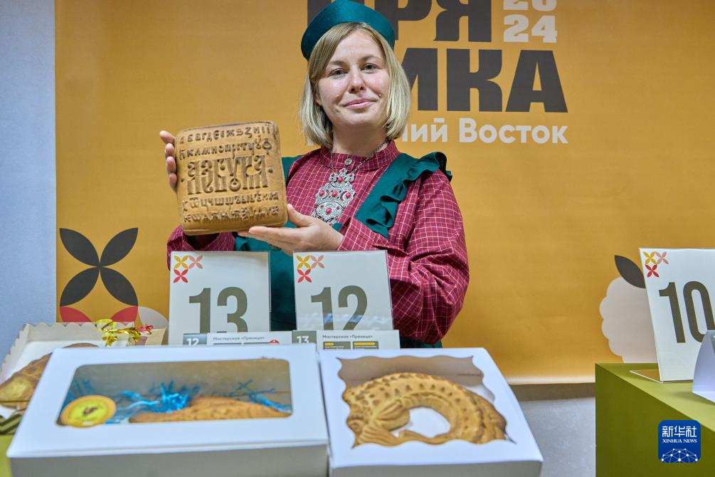 10月11日,在符拉迪沃斯托克姜饼节活动现场,一名工作人员展示姜饼。