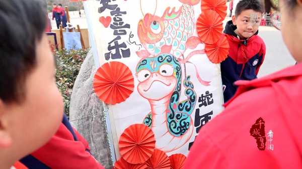 校园内一幅幅童真童趣的精美画作排列整齐,风格各异的金蛇形象在同学们的笔下活灵活现,作品还巧妙地将金蛇与鞭炮、福字、梅花等新年元素相结合,完美诠释了学生们对新年的美好祝福以及对未来生活的憧憬和向往。