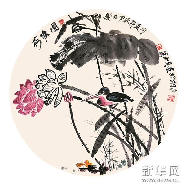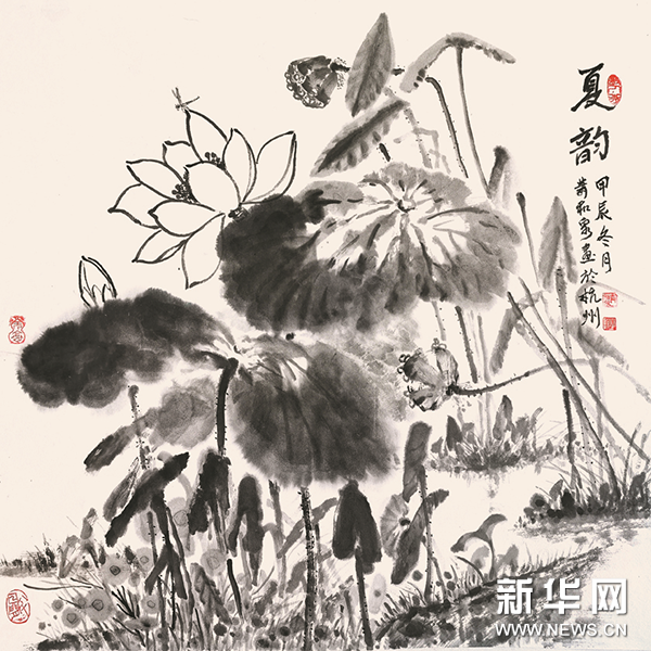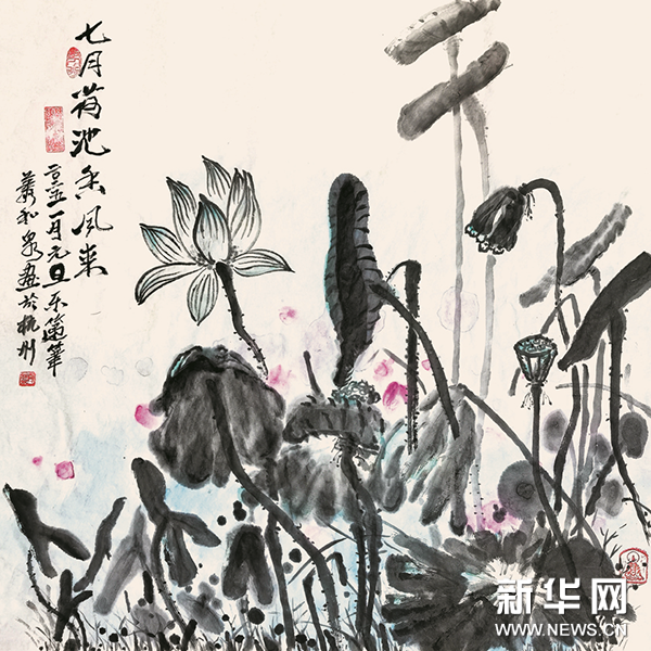 荷花的高雅之美,历来为文人墨客所赞颂。萧和泉是一位画荷高手,他不仅擅长花鸟画,在山水画和人物画领域也颇有建树,其作品题材丰富、构图精妙、色调典雅、韵味深远,展现出独树一帜的艺术风格。在《夏韵》《荷塘图》《七月荷池香风来》等作品中,荷花或娇艳盛开,或含苞待放,或残荷摇曳,形态各异却皆具神韵。他用墨大胆且细腻,浓墨处如泼墨般展现荷叶的厚重质感,淡墨时又似轻烟袅袅,勾勒出荷花的飘逸姿态。那墨色的浓淡干湿、虚实相生,将荷花“出淤泥而不染,濯清涟而不妖”的高洁品性展现得淋漓尽致。