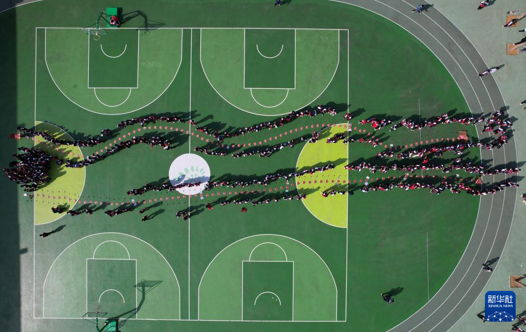 2月26日,石家庄市草场街小学学生在观赏龙头蜈蚣风筝(无人机照片)。