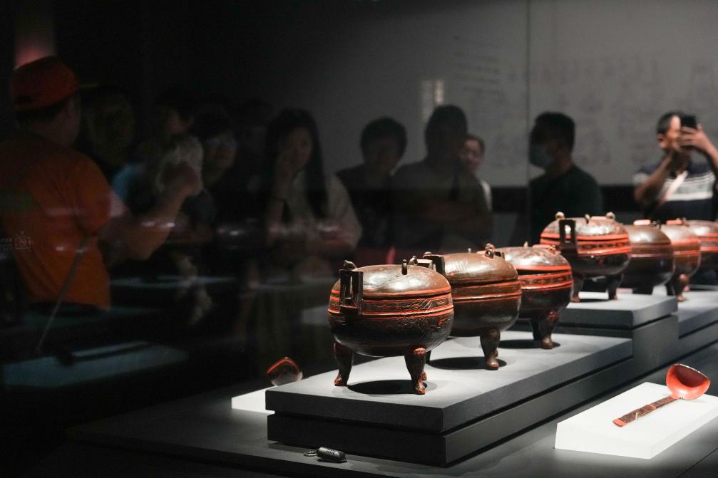 游客在湖南博物院长沙马王堆汉墓陈列展厅观赏漆木器。新华社记者 薛宇舸 摄