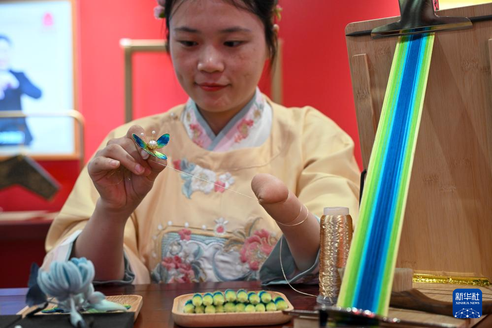 5月17日,残疾人工匠江越在活动现场制作绒花。