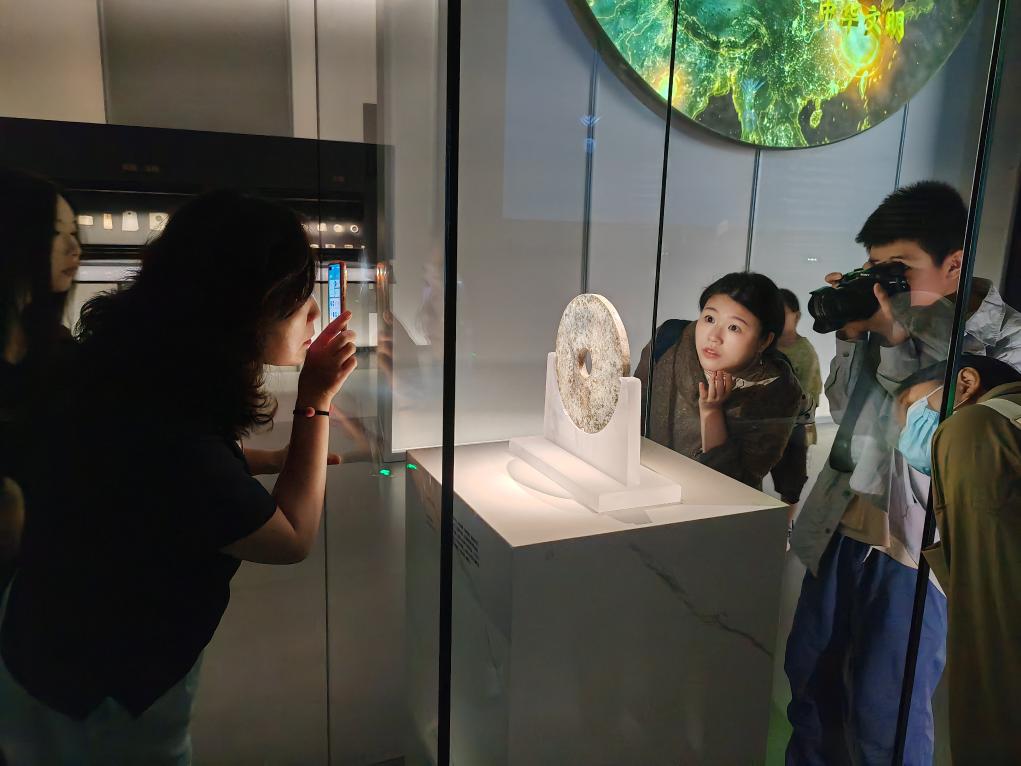 18日,观众在玉架山考古博物馆玉架山遗址厅内观看良渚文化刻符玉璧。新华社记者 冯源 摄