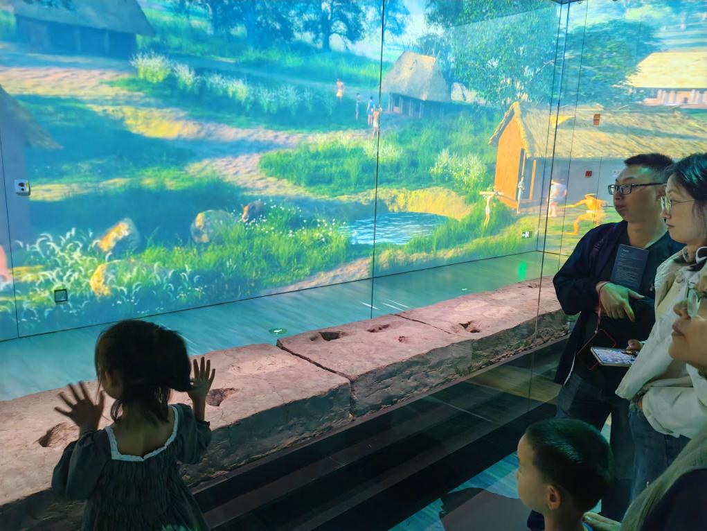 18日,观众在玉架山考古博物馆茅山遗址厅内观看带有牛蹄印的古稻田遗迹。新华社记者 冯源 摄