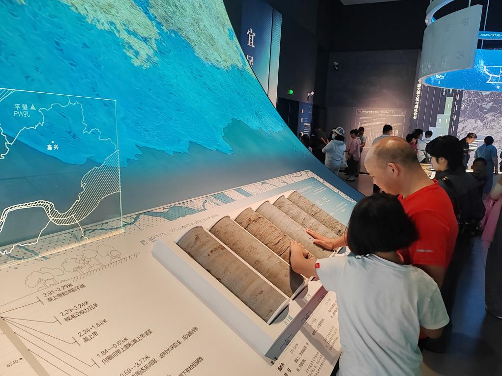 18日,观众在玉架山考古博物馆临平遗址群厅里观察不同类型的岩芯。新华社记者 冯源 摄