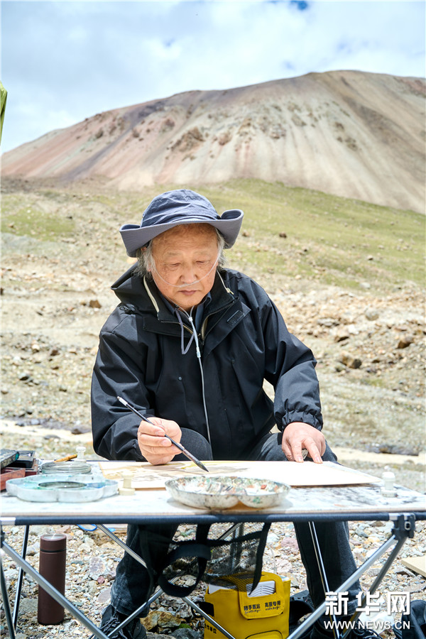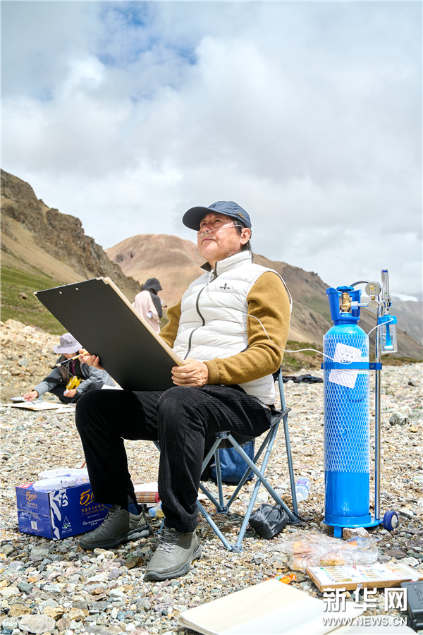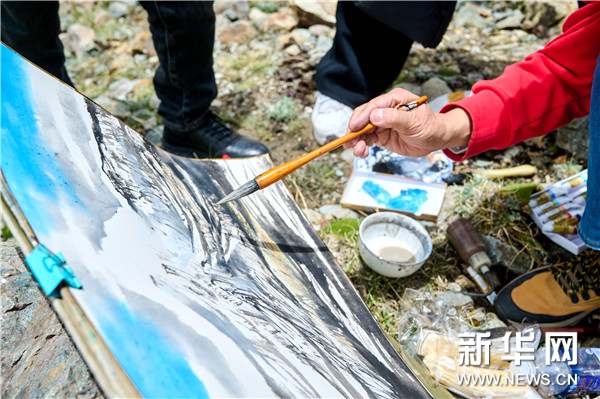 中国国家画院山水所画家、民盟中央美术院副院长顾平在廓琼岗日冰川写生
