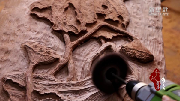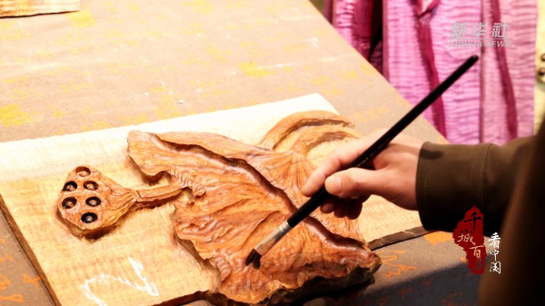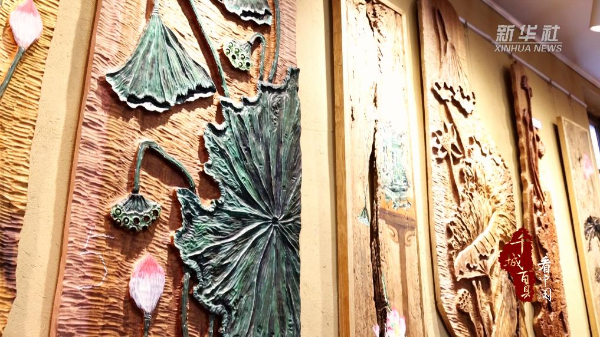 在山东省滕州市级索镇刁庄村,木雕手艺人以刀为笔、以木为纸,将深浮雕的立体厚重与浅浮雕的细腻灵动巧妙融合,并将当地的荷花元素刻画其间,创作出一幅幅独具韵味的木雕挂画。