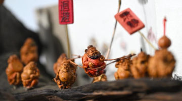 这是展出的残疾人核雕作品《钟馗夜巡》(4月16日摄)。