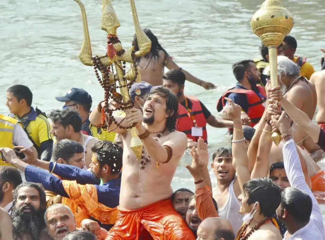 4月14日,在印度北阿肯德邦的赫里德瓦尔,民众在恒河下水沐浴庆祝“大壶节”。(新华社发)