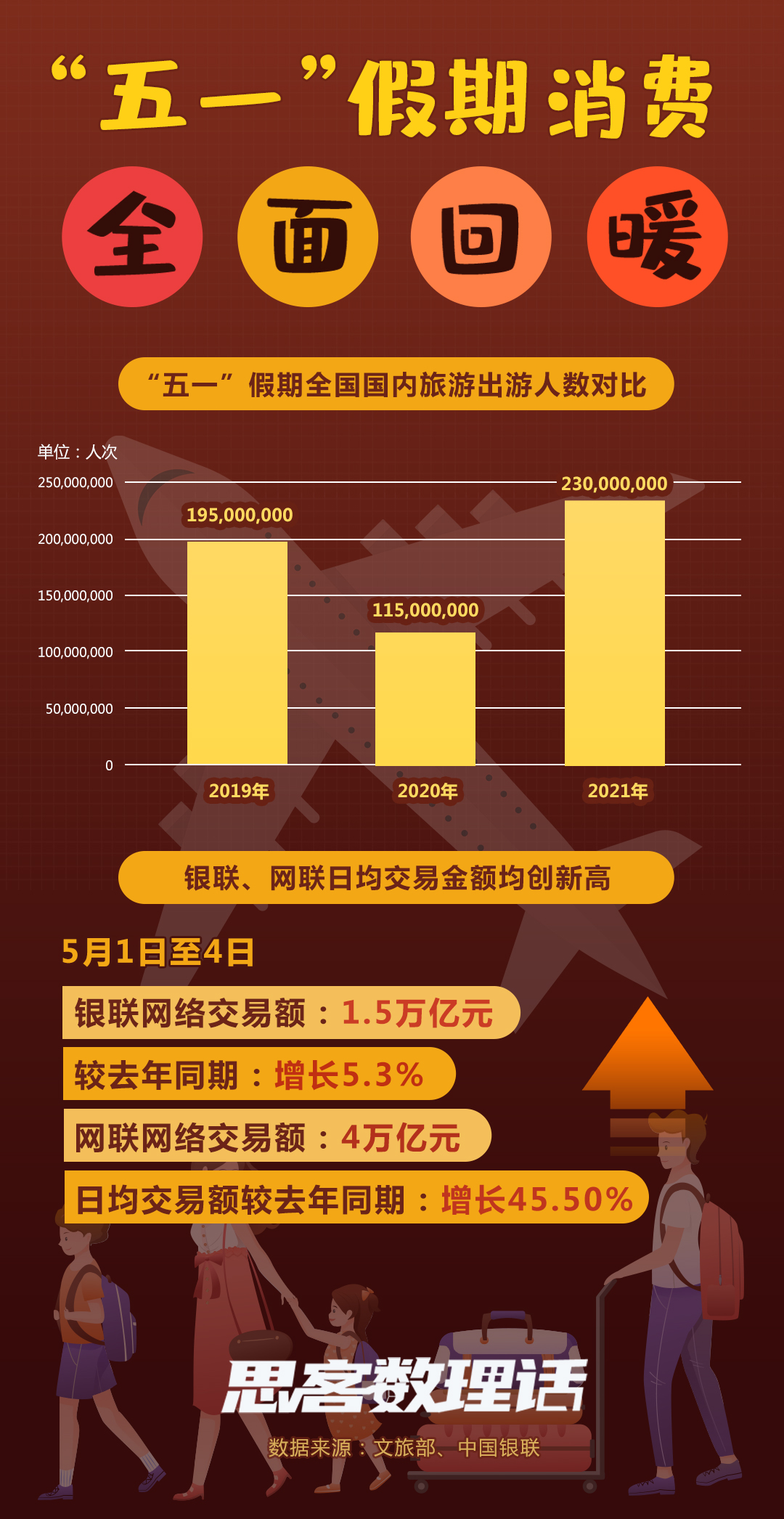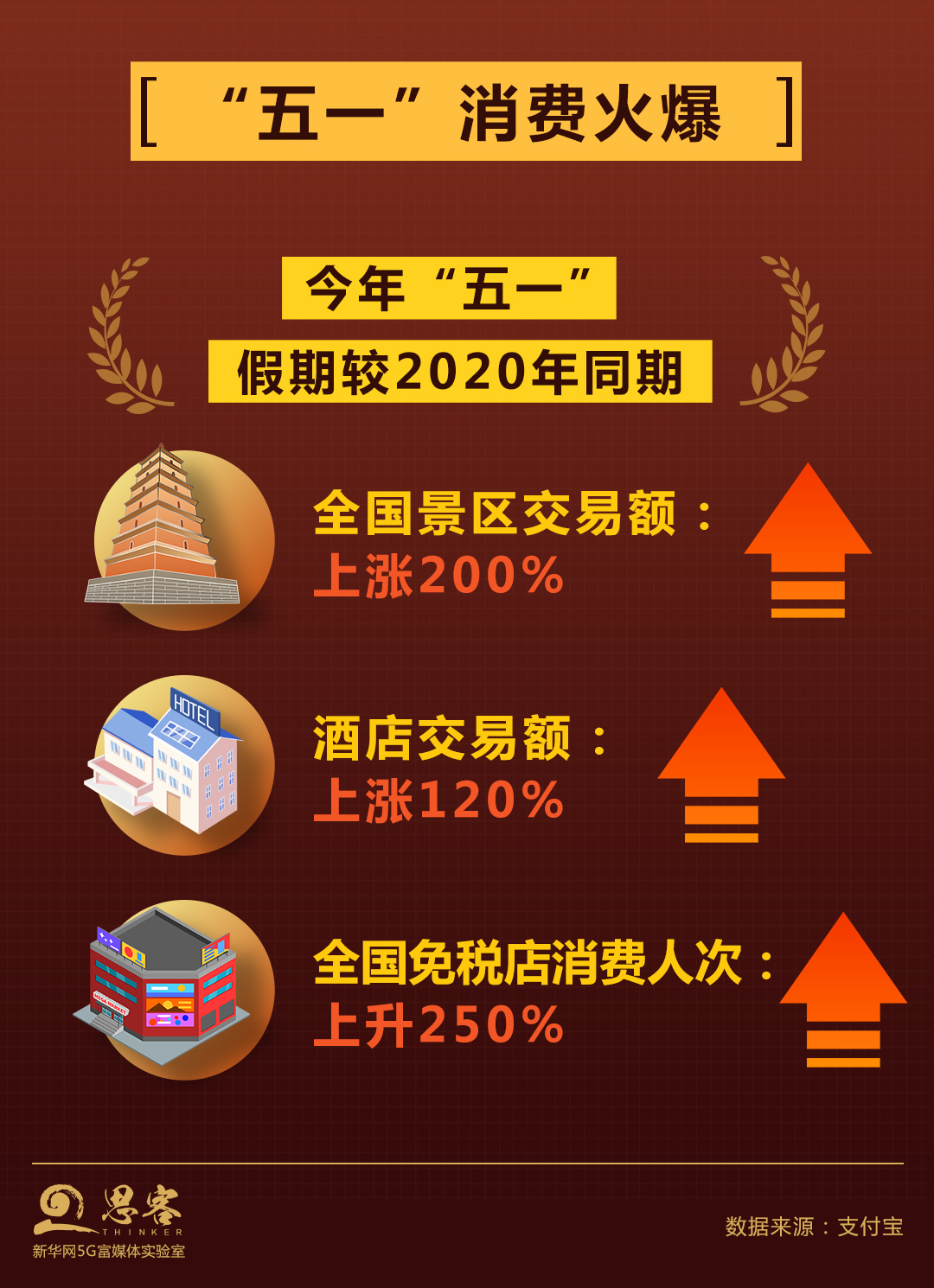 来自支付平台的数据也佐证了今年“五一”消费的火爆。支付宝平台发布数据显示,“五一”期间,全国景区交易额较2020年同期上涨200%,酒店住宿等行业增长翻倍,远超2019年同期,强势反弹。