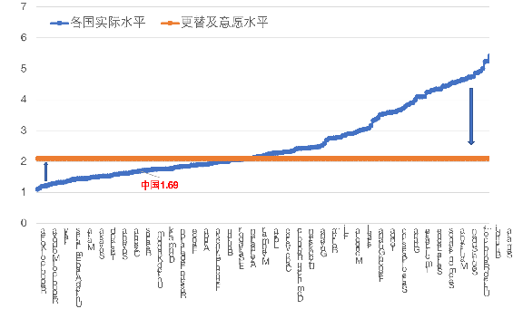 促进人口长期均衡发展,需要破解一个世纪性的难题,即靠什么提高生育率。 图2中蓝色的曲线代表各个国家和地区的总和生育率水平,有的国家和地区仍然高达3-4甚至6-7的水平,也有的国家和地区已经在2-1的更替水平之下,甚至还有少量在1以下的。但是联合国进行的生育意愿调查显示,无论在哪类国家和地区,询问的结果都认为生两个孩子最好。也就是说,人们实际生孩子的数量与其生育意愿是不一致的。