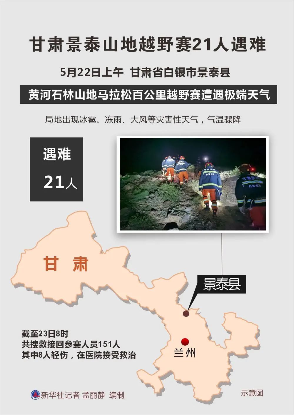 ▲5月23日凌晨,消防救援人员搜救失联人员。新华社发(黄河石林山地马拉松百公里越野赛失联救援指挥部供图)