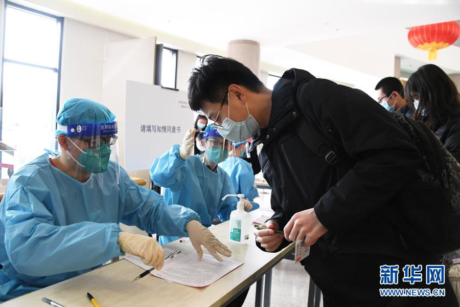 在清华大学新冠疫苗临时接种点,志愿者(前左)指导参加接种的学生填写知情同意书。新华社记者 任超 摄