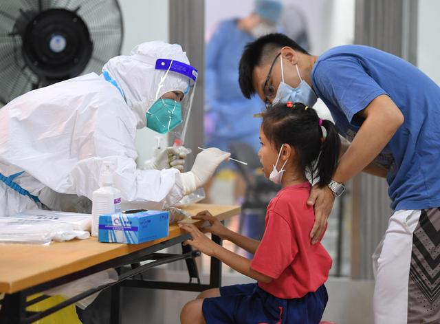 在广州荔湾体育馆核酸检测点,小朋友在家人的陪伴下进行核酸检测采样。新华社记者 邓华 摄