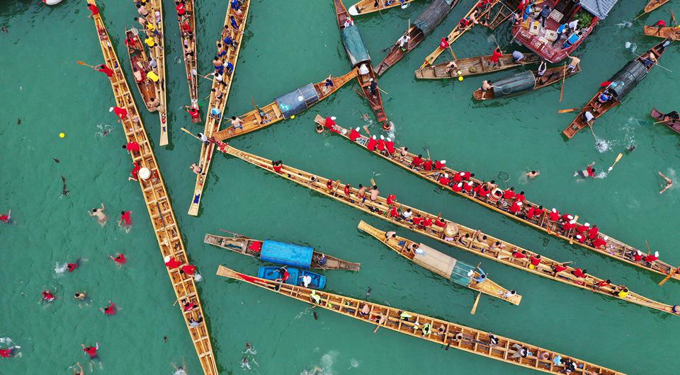 ▲贵州铜仁锦江河上,人们在龙舟赛后参加抢鸭子活动。新华社发(伍卫东摄)