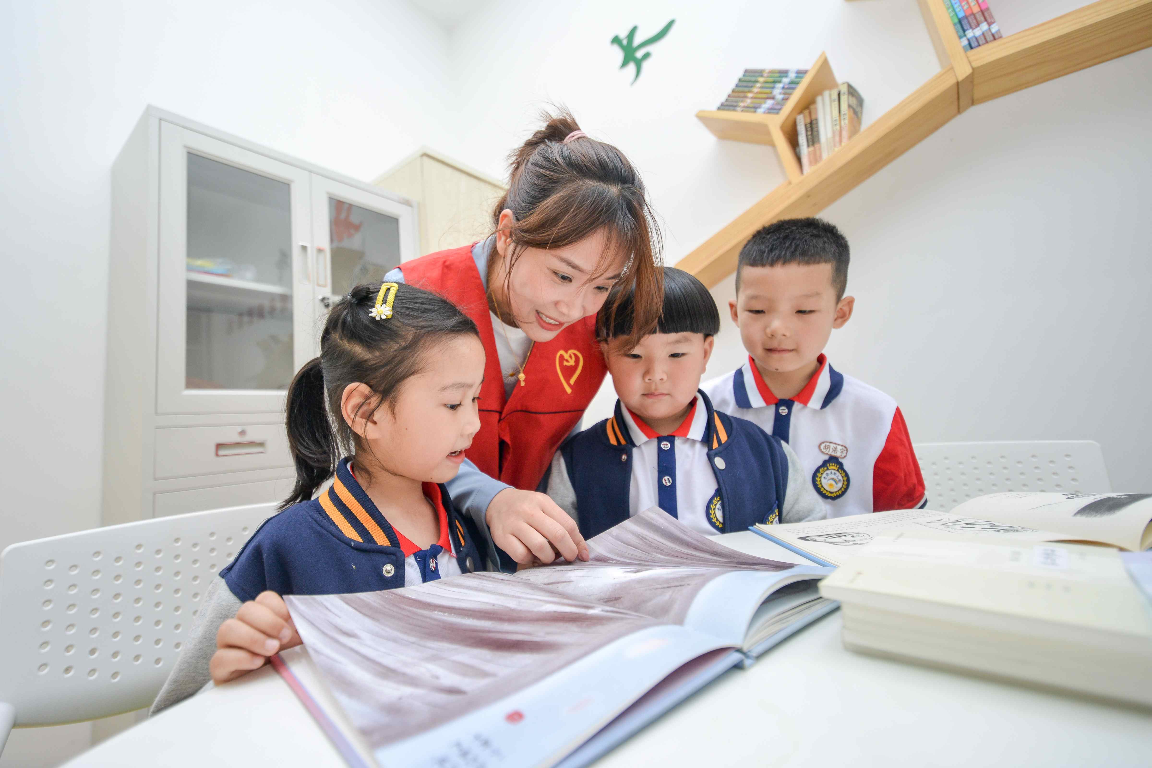 ▲4月29日,浙江省湖州市长兴县太湖街道晨光社区儿童之家阅读驿站内,社区党员志愿者为孩子们讲解儿童绘本。新华社发(吴拯 摄)