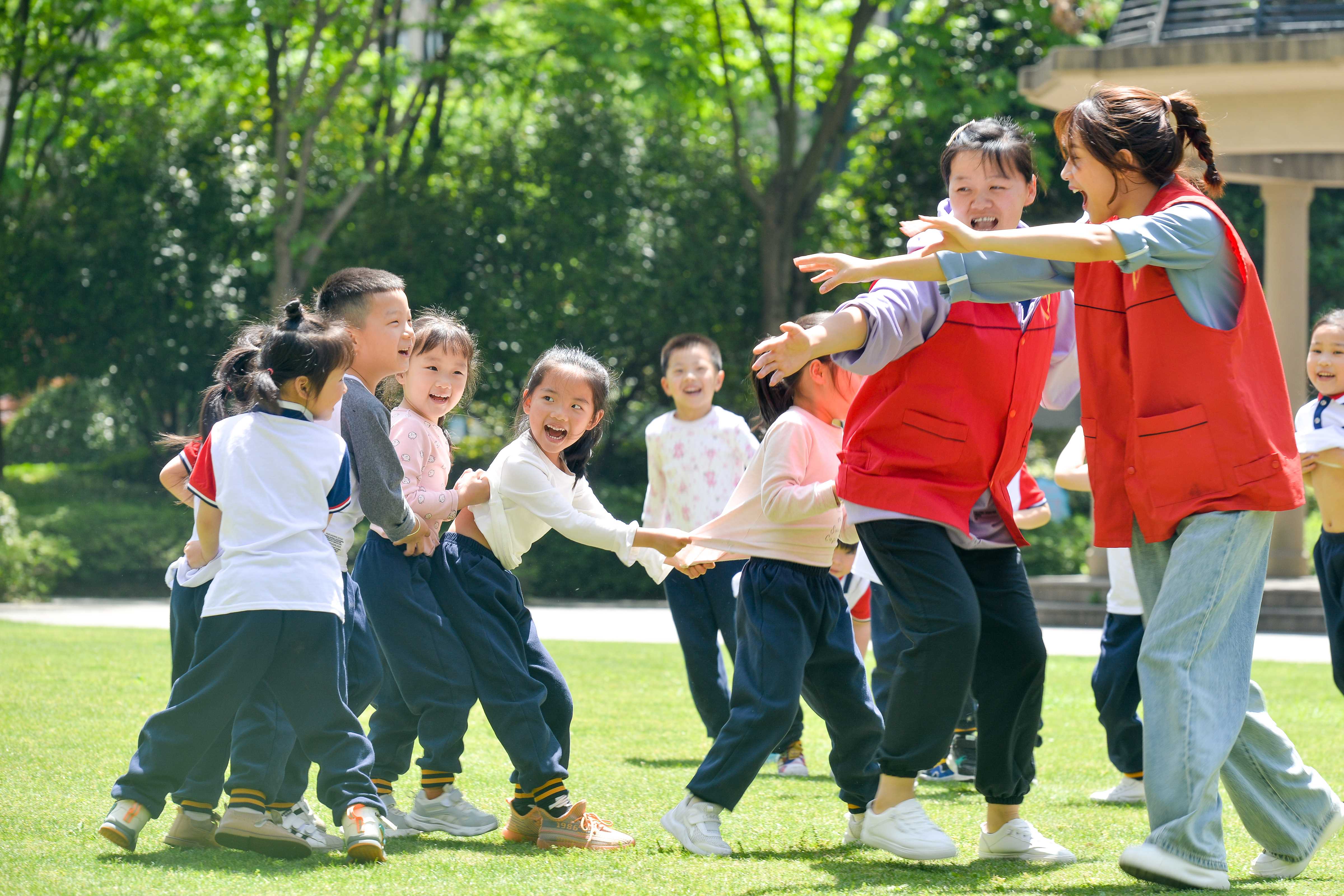 ▲4月29日,浙江省湖州市长兴县太湖街道晨光社区儿童之家外,社区志愿者在课后托管时带领孩子们户外游戏。新华社发(吴拯 摄)