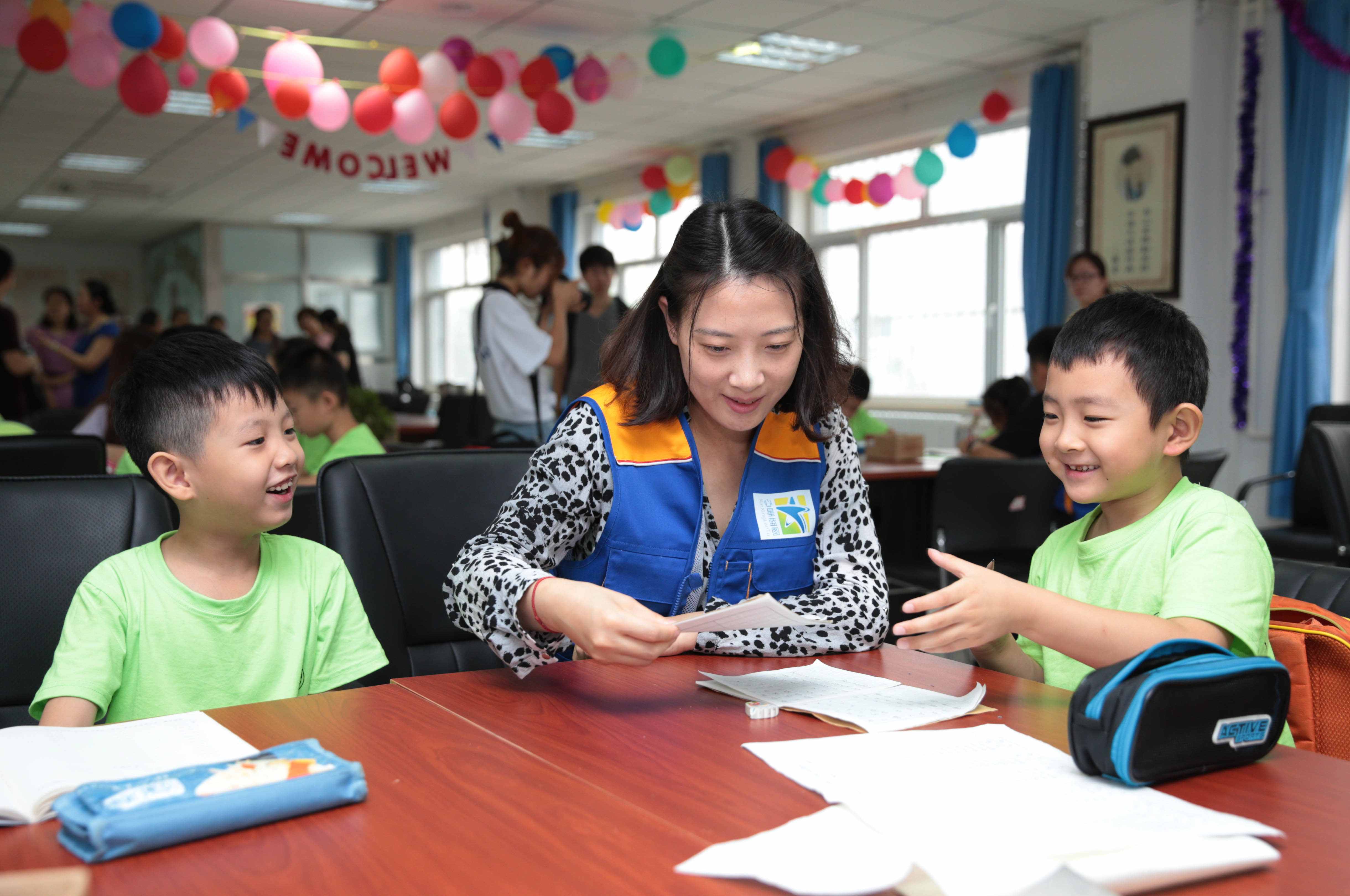 ▲在北京卢沟桥街道工会服务站,托管班老师教小朋友做数学题。新华社记者 才扬 摄