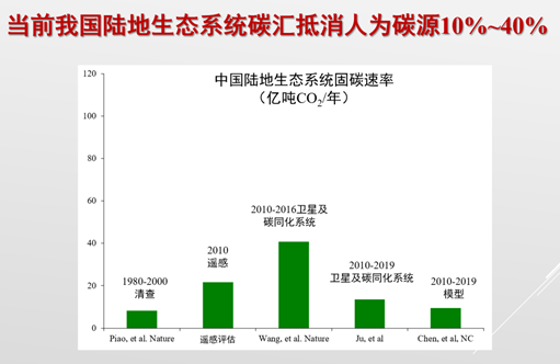 中科院已经做过一些关于碳收支项目的研究。现在认为,我国目前地表碳储量相当于363亿吨二氧化碳,每年固碳速率是10到40亿吨二氧化碳,我们估计森林在2060年以前将会达到固碳的峰值,之后固碳速率就会降低。干旱半干旱区的土壤还很难估计。图6就是用不同的方法测算出来的碳源,数据差别比较大。