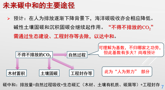 接下来讲未来碳中和的主要途径。我们要考虑到,接近2060年的时候,因为人为排放下降了,二氧化碳分压降低,海洋吸收可能也会相应降低,但降低的幅度现在很难预测。陆地土壤沉积的固碳过程还是会存在,甚至有可能会加强。所以,不得不排放的二氧化碳,就要通过生态建设、工程封存等措施去除掉,这样才能达到中和。