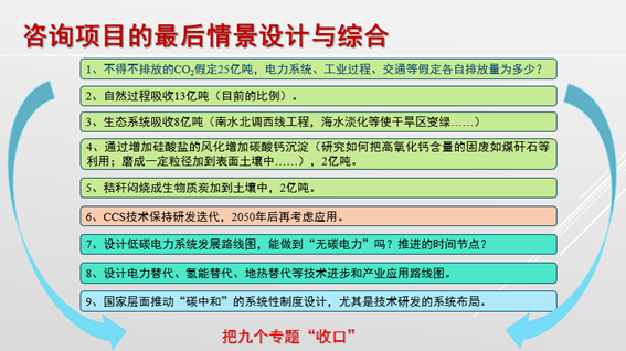 我们这个学部咨询项目是从排放端、固碳端、政策推动这几个角度来考虑的。要特别说明,这个项目只是想把碳中和框架设计出来,把问题清单列出来,至于碳中和具体怎么做,还需要大家共同进行大量的研究。我们现在只是设计一个初步路线图,供大家研讨完善。这个咨询项目设立了九个专题,我把每个专题简单向大家报告一下。