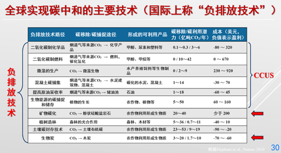 第七个专题是碳捕集利用工程封存技术。我们谈到的负排放技术目前有图8中列出的这些,包括将二氧化碳制成化学品、将二氧化碳制成燃料、微藻的生产、混凝土碳捕集、提高原油采集率、生物能源的碳捕捉和存储、硅酸盐岩石的风化和矿物碳化、植树造林、土壤有机碳和土壤无机碳、农作物的秸秆烧成木炭还田等等。这些负排放技术中,前面几项是国际上所谓的CCUS技术,后面用红箭头标出来的这两项——矿物碳化和生物炭,我国研究得还比较少。