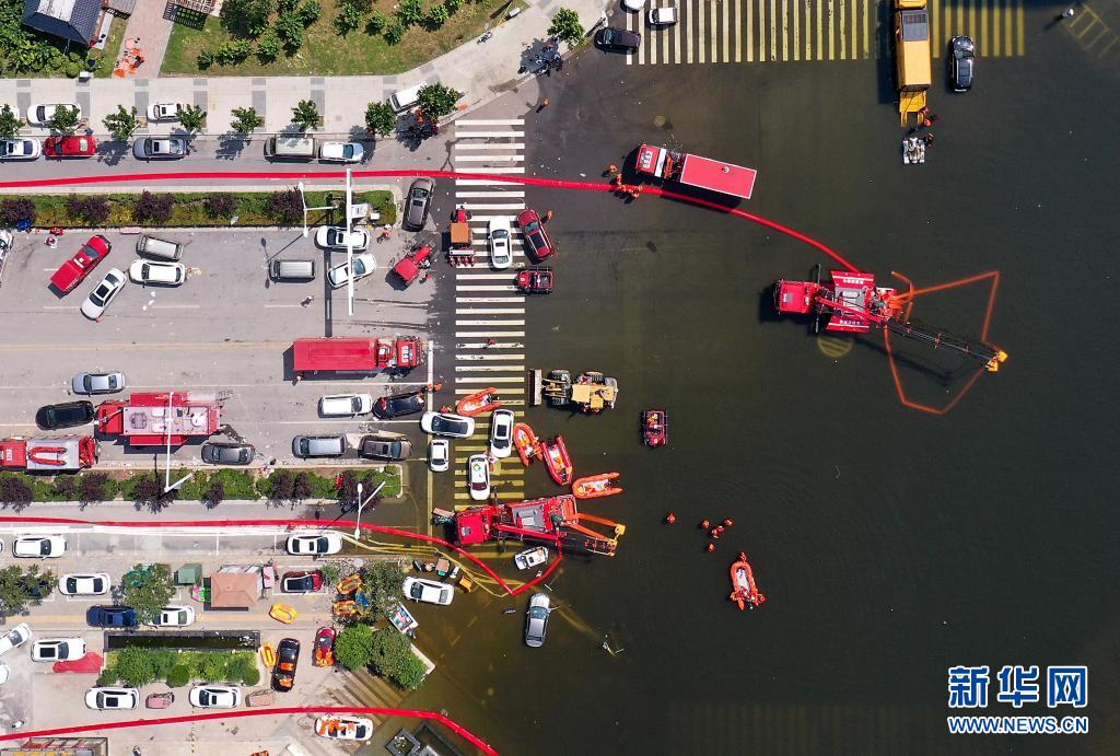 ▲7月27日,救援人员在卫辉市区架设排涝设备(无人机照片)。新华社记者 李安 摄