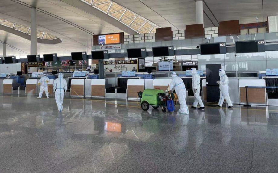 工作人员在南京禄口机场T2航站楼内进行消杀。图/新华社