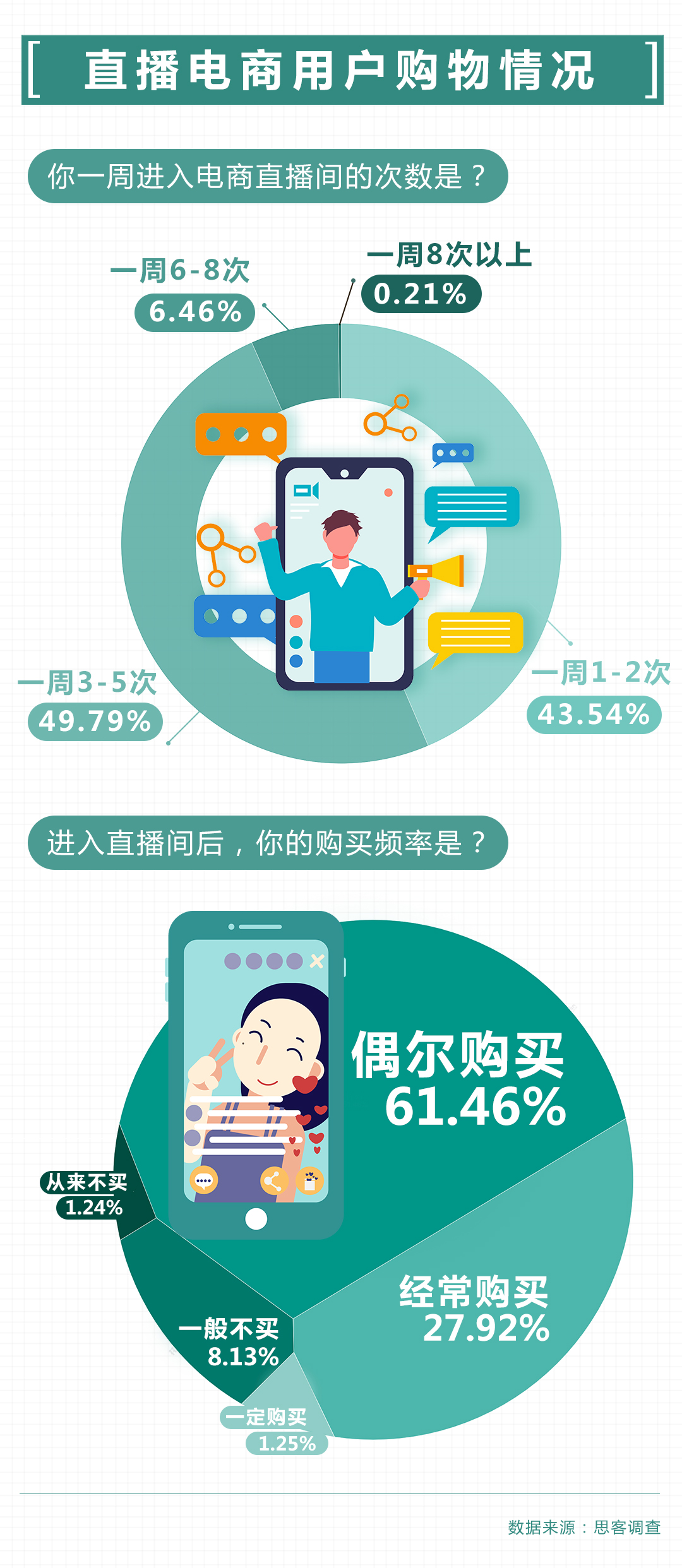 截至2021年6月,我国直播电商用户规模达3.84亿。思客调查显示,直播电商用户中,一周进入直播间1-2次的受访者占43.54%,一周3-5次的受访者占49.79%。进入直播间后,有61.46%的受访者表示偶尔购买产品,27.92%的受访者表示经常购买产品。