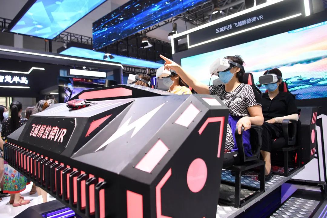 ▲8月23日,观众在2021智博会上通过VR技术体验重庆美景。 新华社记者 唐奕 摄